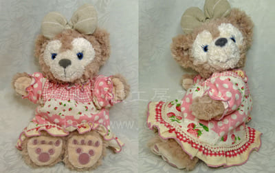 「ダッフィー」「シェリーメイ」(Sサイズ、身長43cm)に着せると半そでスモックになります。型紙を拡大or縮小コピーすれば他のサイズの縫いぐるみや人形にも着せられます(参考記事)。