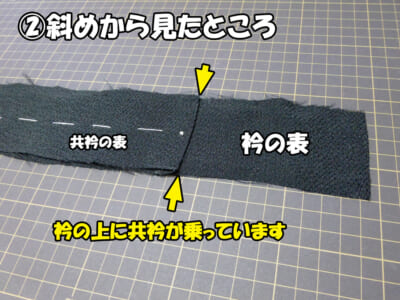 (1)衿の端をおくみの端に合わせて裏側に折り返し、折り返し部分を約1cm残して切り落とします。