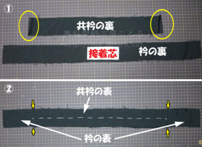 (1)共衿の端を裏側に1cm折り返してアイロンをかけます。そして、衿の裏側の中心に接着芯(4cm×10cm)を貼り付けます。