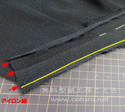 【4】先ほど縫った縫い代を倒してアイロンをかけます。このとき、写真の黄色矢印の方向に縫い代を倒すのが本物の着物仕様です。ですが、しっぽ穴を開ける予定の方は、後身頃の縫い代は開いてアイロンをかけた方が綺麗に仕上がります。