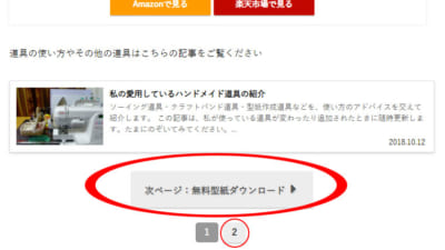 なので、「おすすめの道具」の一覧が終わった直後にある「次ページ:無料型紙ダウンロード」というボタンか、その下にある「2」というボタンをクリック(タップ)してみてください。すると、最初に「無料型紙ダウンロード」の項目があり、次に「作り方」の項目が見つかります。