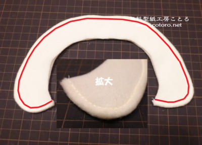 【5】ミシン線に垂直に切れ込みを入れます。カーブのきついところは1cm間隔ぐらい、カーブの緩いところは3cm間隔ぐらいです。ミシン線を切ってしまわないように気を付けてください。これをやっておくと表に返したときに布が引きつれにくいです。