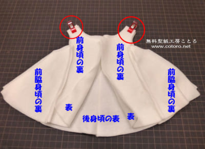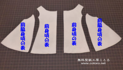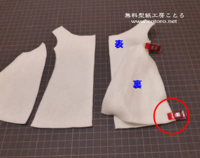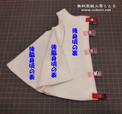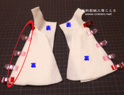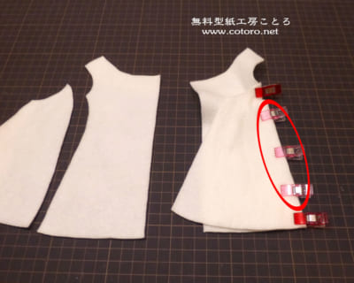 【16】反対側の前身頃と前脇身頃もクリップなどでとめます。