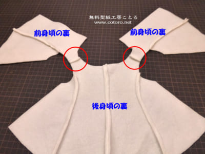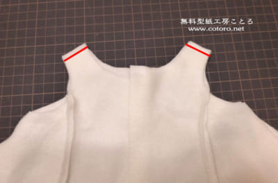 【23】前身頃と後身頃の肩部分を中表に合わせてクリップなどでとめます。