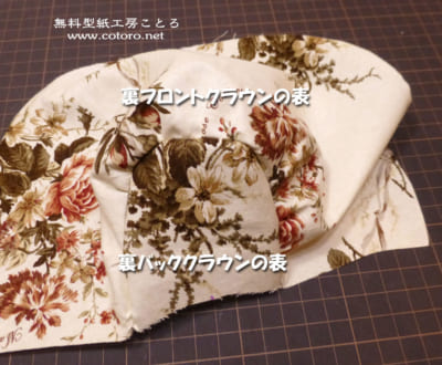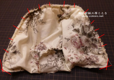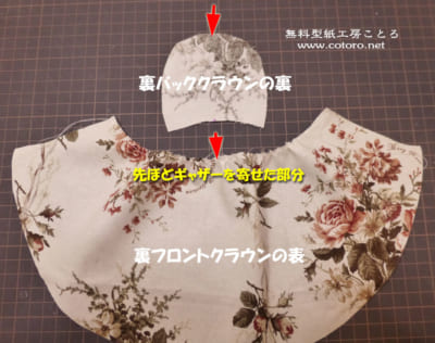 【28】裏フロントクラウンのバッククラウン側のカーブにギャザーを寄せます。ギャザーを寄せるにはミシンでやる方法と、手縫いでやる方法がありますが、どちらでもOKです。