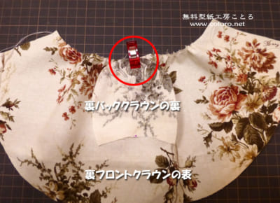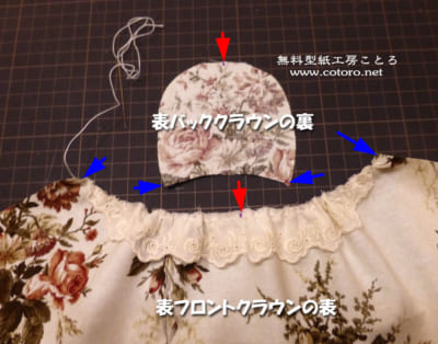 【36】【首周りにレースを付ける場合のみ行う】裏バッククラウンと裏フロントクラウンの表に、ギャザーレースの表が見えるようにとめます。レースの端は、下側にずらして、端から約2cmあくようにしてください。