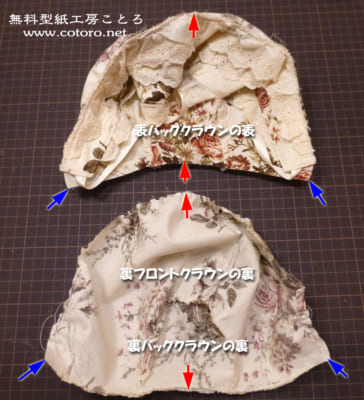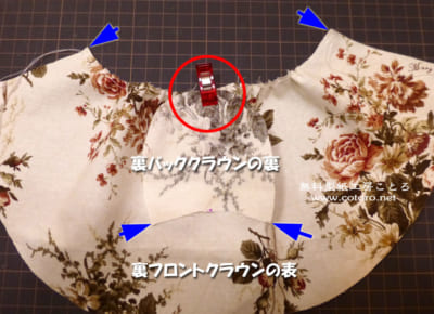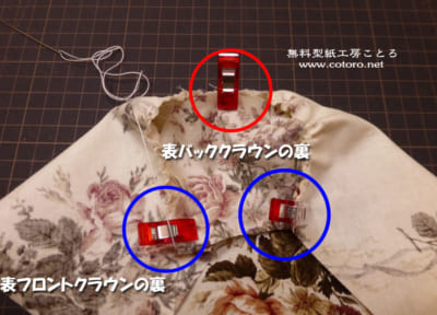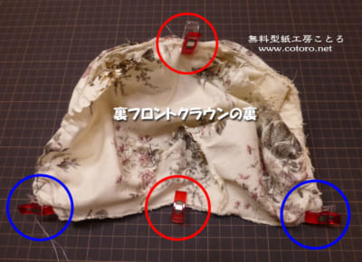 【55】工程【48】のように裏フロントクラウンにギャザーを寄せます。そして、クラウンの中心のしるしの位置(赤矢印)とカドの位置(青矢印)を確認します。