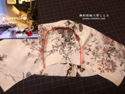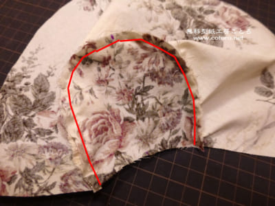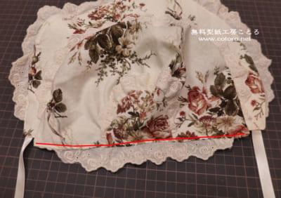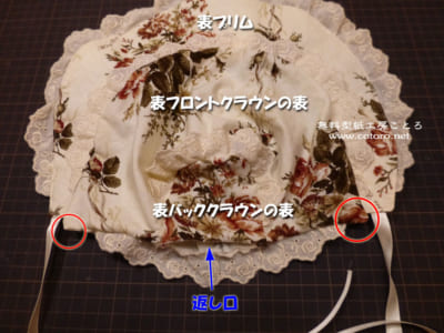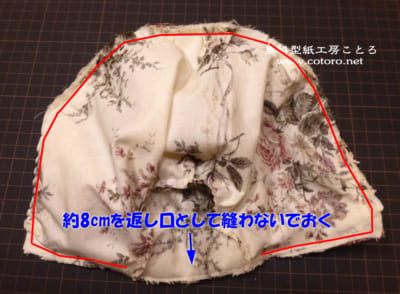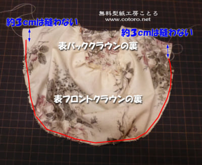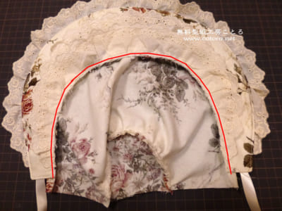 【58】赤線を縫い代5mmでぐるりと縫いますが、レースのひらひらや、リボンを巻き込まないように注意してください。このとき、バッククラウンのあたりを、約8cm縫わないでおいてください。ここが返し口になります。