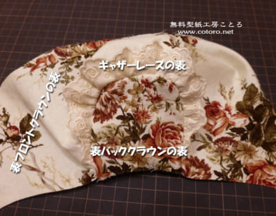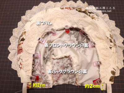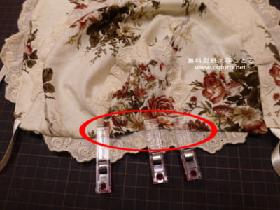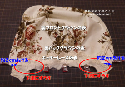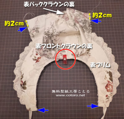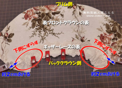 【39】【表フロントクラウンと表バッククラウンの間にレースを付ける場合のみ行う】表フロントクラウンの表に、ギャザーレースの表側が見えるようにクリップなどで止めます。この時、レースの端は下側にずらして、表フロントクラウンの端から約2cmあけてください。