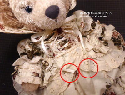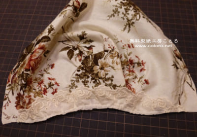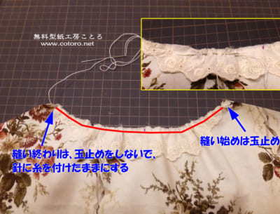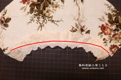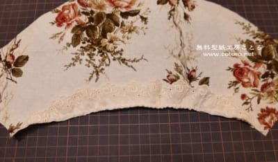 【38】【首周りにレースを付ける場合のみ行う】布からはみ出しているレースを切ります。