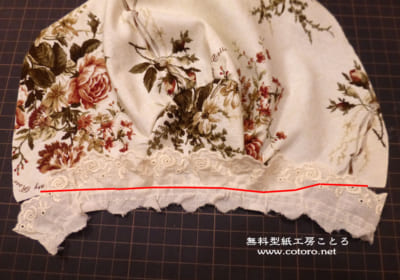 ※ ミシンでギャザーを寄せる方法は工程【28】~【33】で解説しています。ですが、レースが付いた布(重なっている布)は、ミシンでギャザーが寄せにくいため、おすすめしません。レースを付けていなければミシンでもOKです。