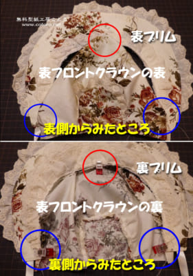 【49】表フロントクラウンと表プリムの中心のしるしを中表に合わせます。そして、プリムの端と、表バッククラウンの端から2cmの位置を確認します。