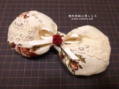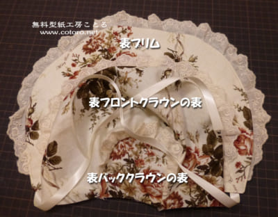 【64】【省略OK】頭の中心のリボンを作ります。リボンはプリムに縫い付けてもいいですし、ゴムひもで頭に固定してもいいですね。