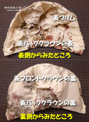 【54】プリムを、表クラウンの表側に倒します(入れ込みます)。裏側からみると、プリムが全く見えない状態になります。