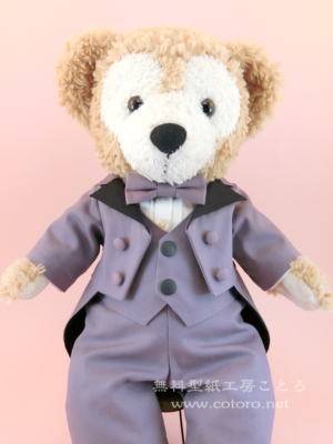 型紙を拡大・縮小して調節すると、いろいろな縫いぐるみや人形に着せられます(型紙の拡大縮小についてはこちらをご覧ください)。