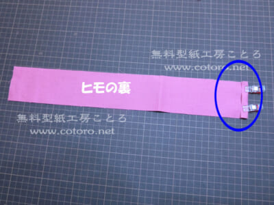 【2】ヒモの端を片側だけ、裏側に1cm折ります。