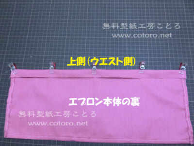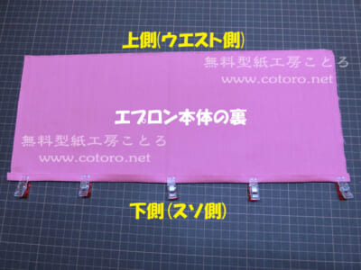 【13】エプロン本体の上側(ウエスト部分)を裏側に2cm折ってクリップなどでとめます。