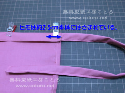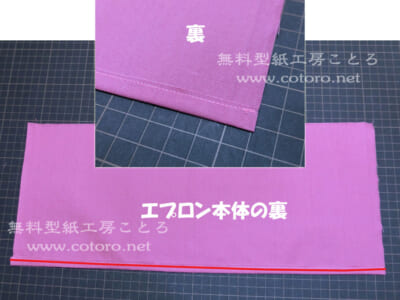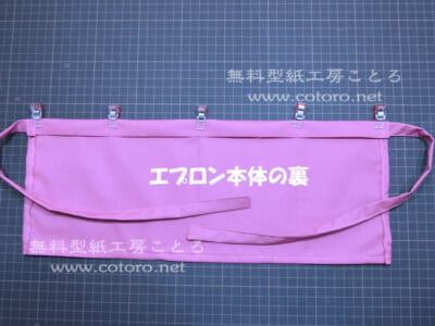 【9】エプロン本体の下側を裏側に1cm折って、クリップなどでとめます。
