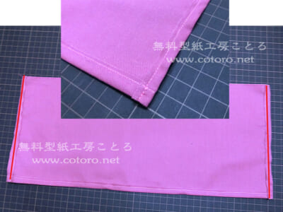 【12】先ほど折った部分の上を赤線のように縫ってとめます。