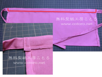 【10】先ほど折った部分の上を赤線のように縫ってとめます。