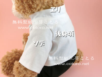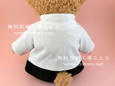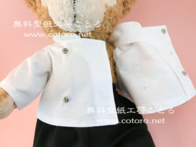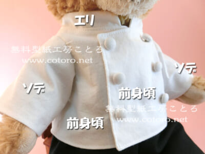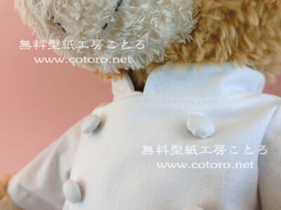 Sサイズダッフィー等の縫いぐるみにちょうどいい、コックコートの無料型紙と作り方です。装飾などをアレンジすれば王子様服や軍服にもなります。