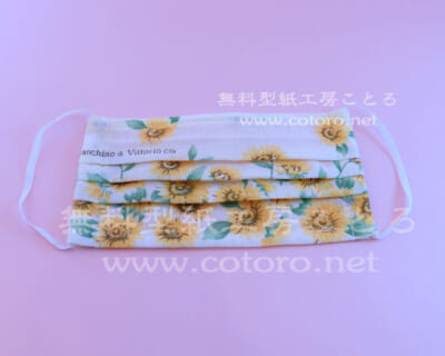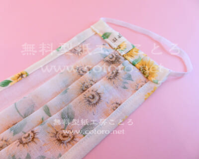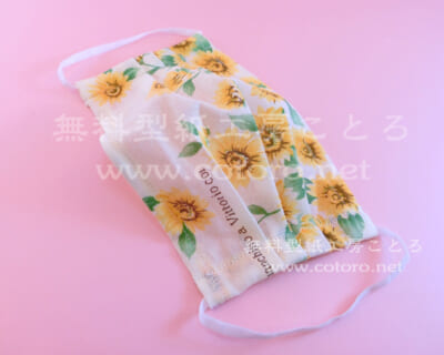 鼻の部分にワイヤー(ノーズフィッター)が入っています(省略可能)。このヒマワリの布はハンカチ(さらし・手ぬぐいのような生地)をリメイクしたのですが、折り目が付きやすいく(=プリーツが作りやすく)縫いやすかったです。