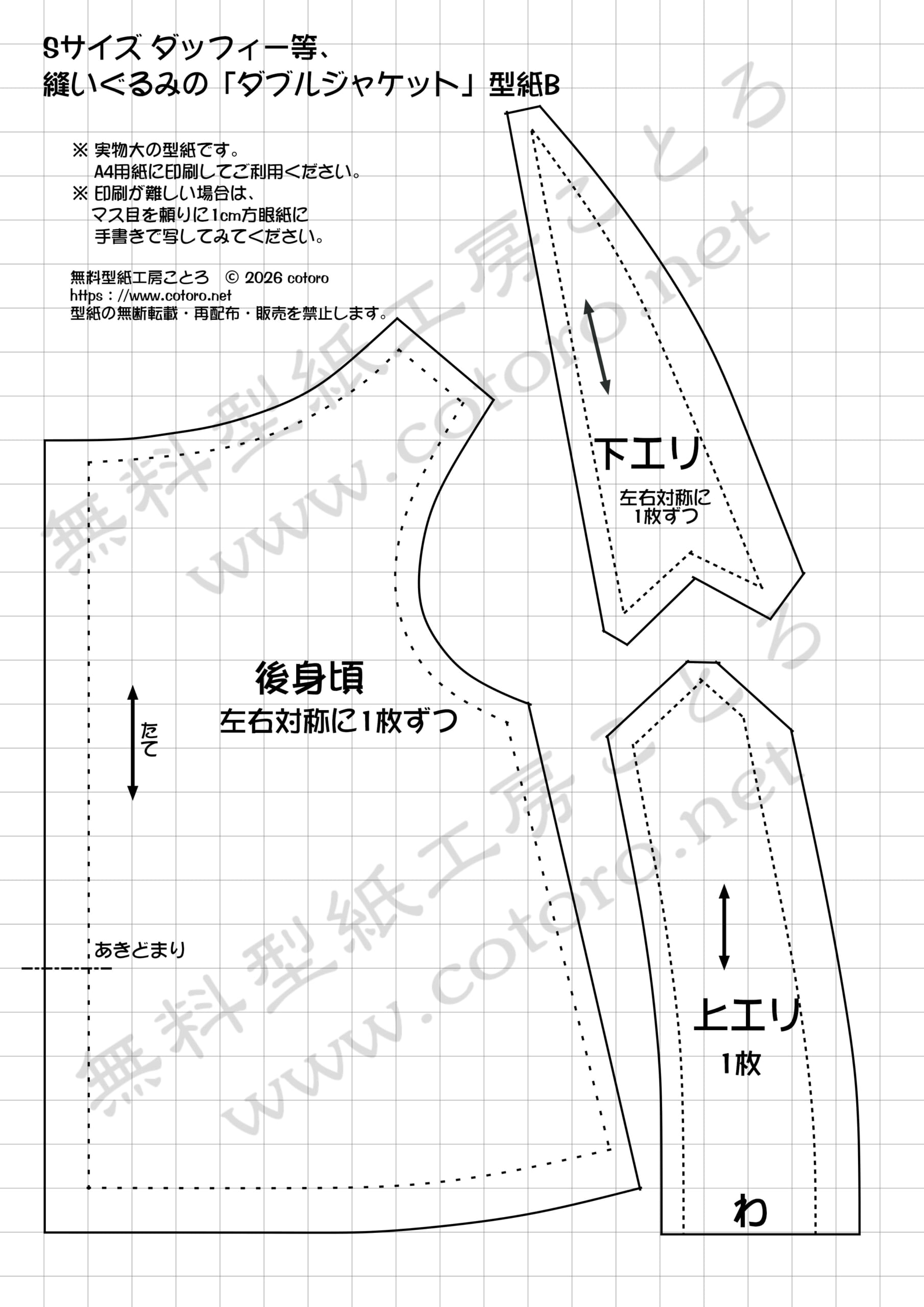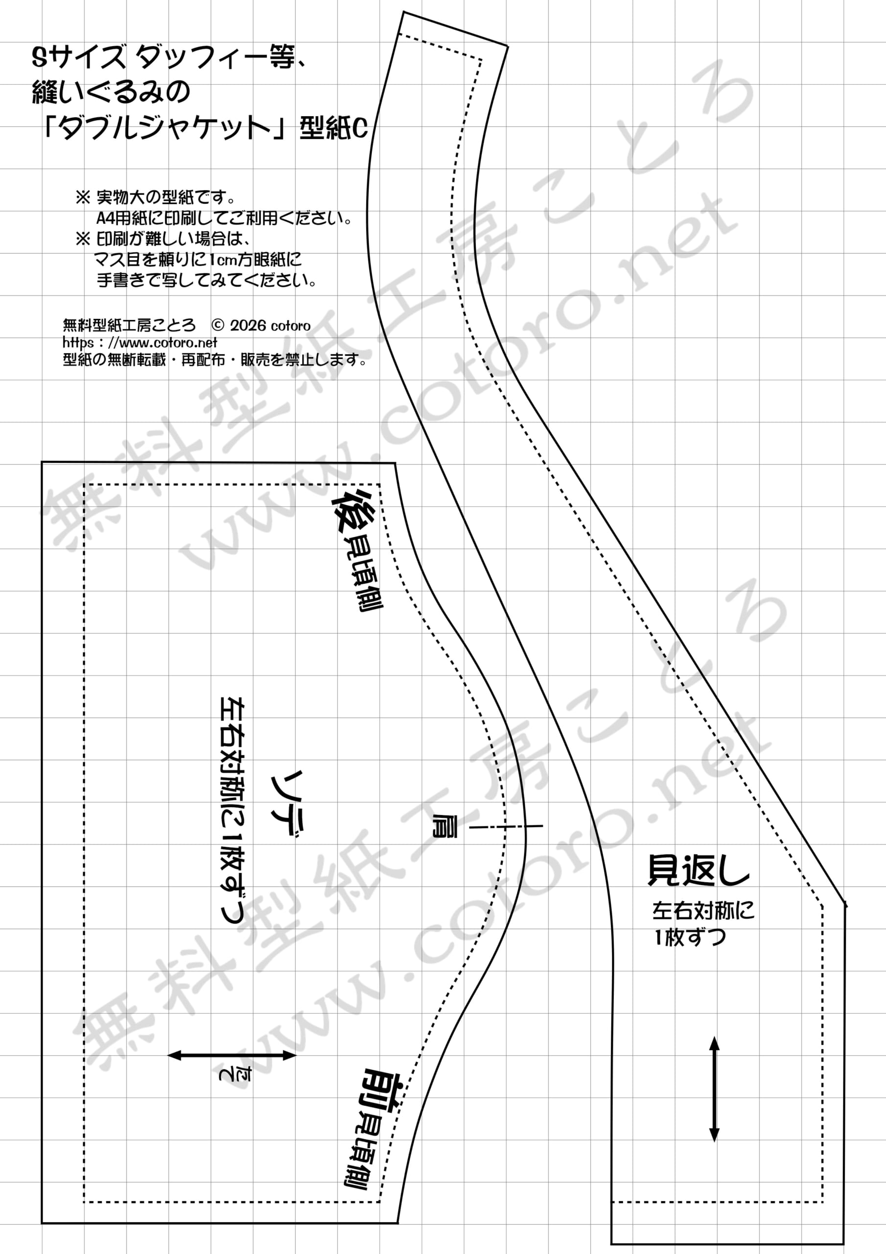 実物大の型紙です。「余白なし(余白ゼロ)」の設定で、A4用紙に印刷して使ってください。うまく実物大に印刷できない場合はこちらをご覧ください。また、印刷する環境がない場合は1cm方眼紙を用意し、型紙画像のマス目(1cm幅)を頼りに手書きで写してみてください。