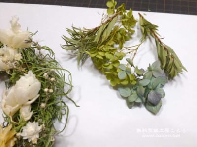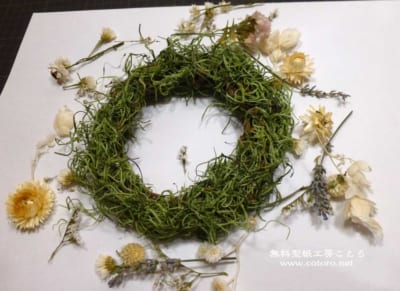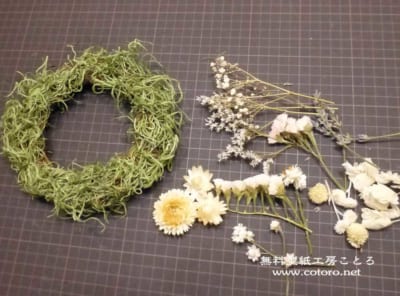 キットの中身は、リースベース、スパニッシュモス、ワイヤー、お花、葉っぱ、作り方説明書です。