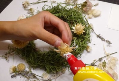 ボンドを使って、大きいお花から付けていきました。長い茎はハサミでカットすると付けやすかったです。