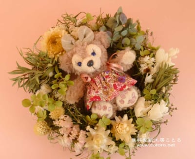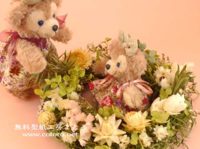 大きさは、輪の中にシェリーメイの縫いぐるみストラップがすっぽり入るくらいです。お花のベッドに寝ているみたいですね。