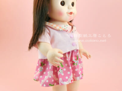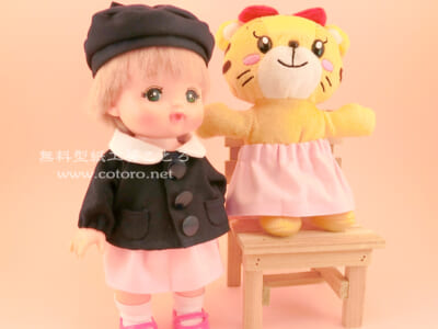 メルちゃん(左)、はなちゃん(右)は、同じサイズのスカートを履いています。型紙に書いてある「タイプ1」のサイズです。(はなちゃんは、ベネッセこどもちゃれんじの付録です)