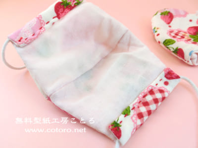 そして、裏地(白い布)の両端には、表地(いちご柄の布)が見えています。その表地(いちご柄の布)の端に赤い糸の縫い目が見えますね。