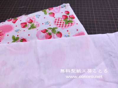 完成写真では、表地にいちご柄のダブルガーゼ、裏地に白いダブルガーゼを使っています。楽天市場で購入しました。⇒ダブルガーゼの詳細を、楽天市場で見る、Amazonで見る。