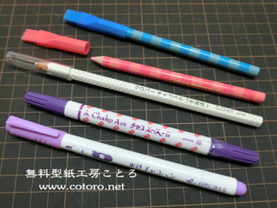 こちらも専用品を紹介しますと、布にしるしを付ける専用のペンは「チャコペン」という名前で売られています。⇒チャコペンの詳細を、楽天市場で見る、Amazonで見る。