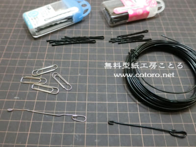 ひも通しは、ヘアピンでも代用できます。ヘアピンも無い場合は、クリップや針金などで自作してみてください。細長い棒状で、片方の端にゴムひもを通せる穴があればOKです。