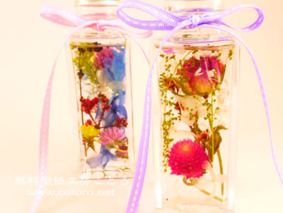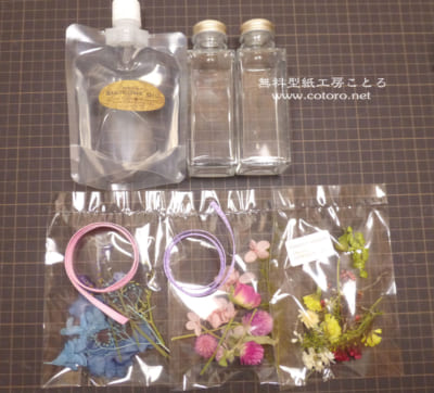 作成キットの中身は、ガラスのボトルが2本、シリコンオイル、ドライフラワー、リボンです。
