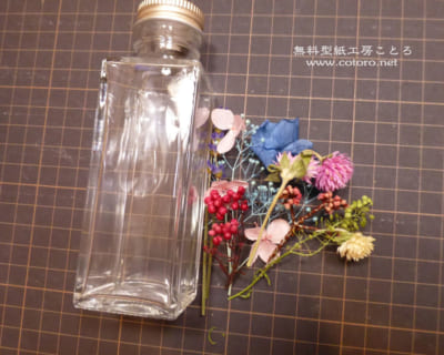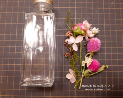 まずは、どのお花を入れるかボトルの横に並べてみました。いろいろな色をまとめるのは難しいので、ほとんどピンクのお花セットの中から選んで、同系色のお花で無難にしてみました。