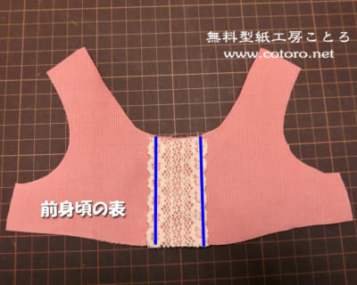 【2】【前身頃に飾りを付ける場合のみ行う】トーションレースを前身頃の真ん中に置いて、左右を縫います。トーションレースと同じ色の糸を使うと目立ちません。