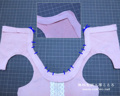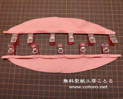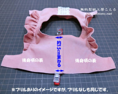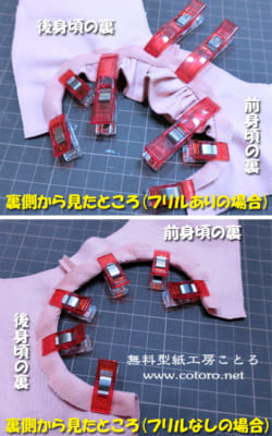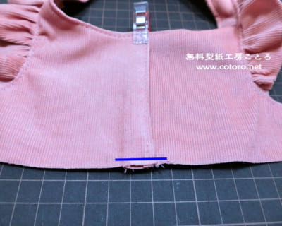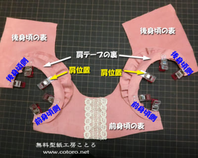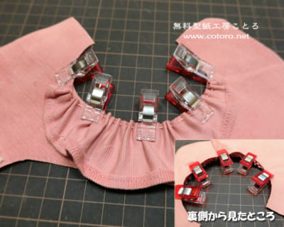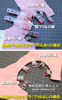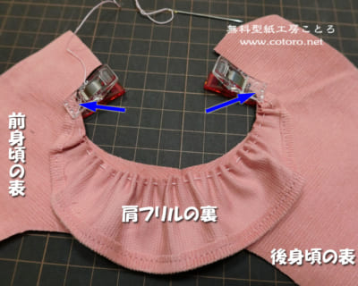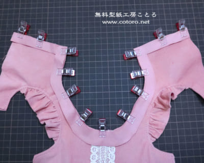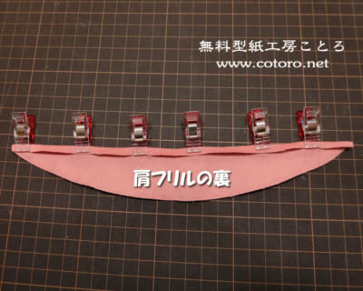 【12】【肩フリルを付ける場合のみ行う】先ほど確認した、肩フリルの端と、フリル付け位置を合わせてクリップなどでとめます。