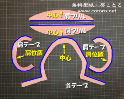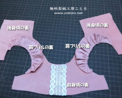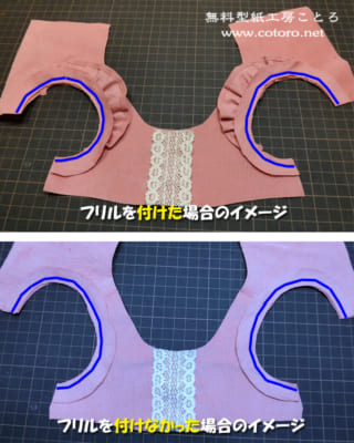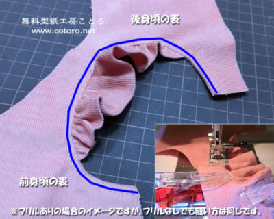 ※肩フリルを付けた場合は、身頃と肩テープで肩フリルをはさむ形になります。