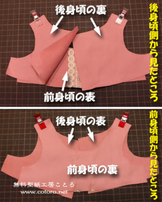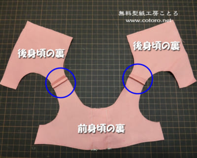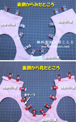 【16】肩テープと身頃を中表にあわせます(表地同士をあわせる)。肩テープは裏側が見えている状態です。肩テープには「前身頃側」と「後身頃側」がありますので注意してください(型紙に書いてあります)。