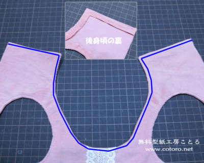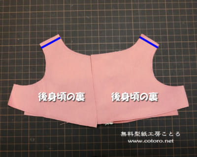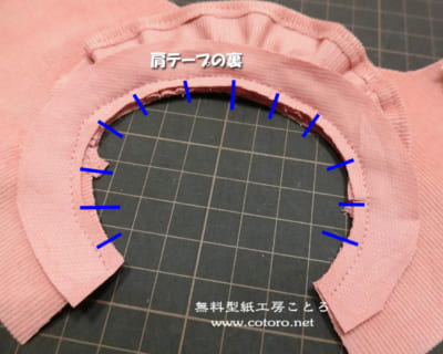 肩テープは、肩位置にしるしと「後身頃側」「前身頃側」がどちらかわかるようにもしるしを付けてください。