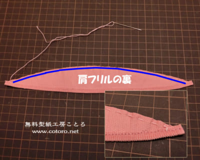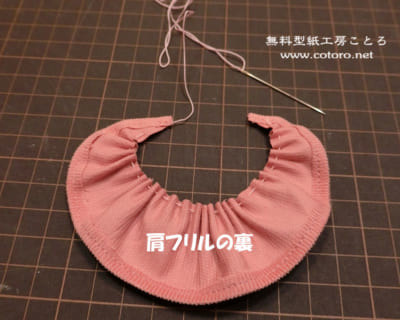 これから、肩フリルにギャザーを寄せますが、ここでは、手縫いでギャザーを寄せる方法を紹介します。ミシンでギャザーを寄せたい場合は工程【30】~を参考にしてください。