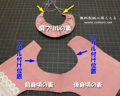 【15】【肩フリルを付ける場合のみ行う】反対側の肩フリルも同じように身頃に縫い付けます。