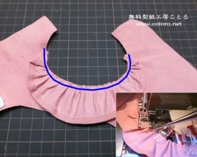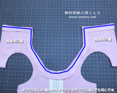 【14】【肩フリルを付ける場合のみ行う】青線を縫い代3mmぐらいで縫います。肩フリルが均一になるように目打ちなどでギャザーを整えながら縫うとやりやすいです。これは仮止めですが、後でほどきません。