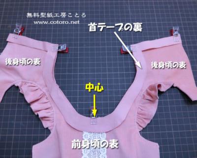 【22】肩テープと同じように首テープと身頃も中表に合わせます。最初に、前身頃と首テープの中心同士やカドをクリップで止め、