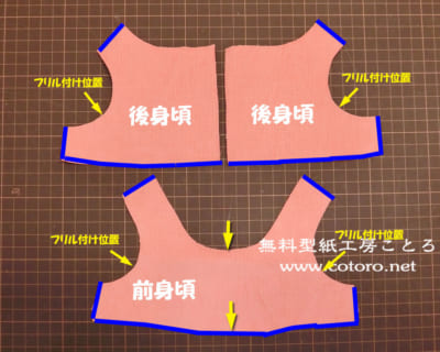 【11】【肩フリルを付ける場合のみ行う】身頃は表を上にして(見えるようにして)置き、肩フリルは裏を上にして置きます。そして、身頃の「フリル付け位置(型紙に書いてあります)」と肩フリルの端の位置(黄色矢印)の位置を確認します。