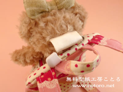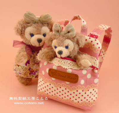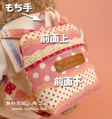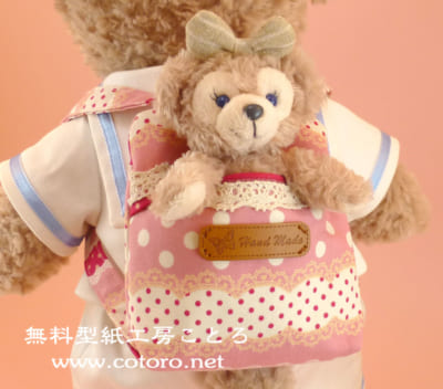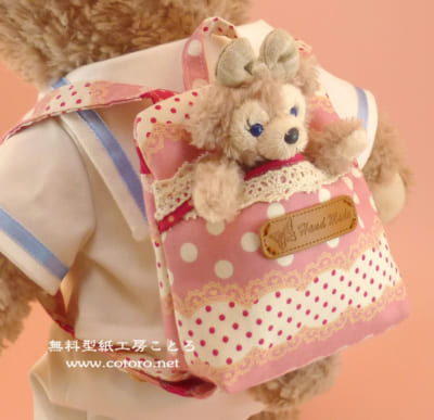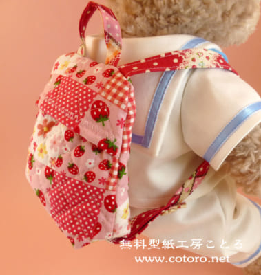 Sサイズシェリーメイなどのぬいぐるみが背負うのにちょうどいい、リュックサックの作り方です。型紙を拡大・縮小すると、いろいろな縫いぐるみや人形にも使えます(型紙の拡大縮小についてはこちらをご覧ください)。