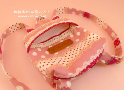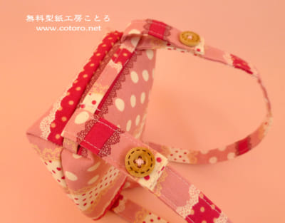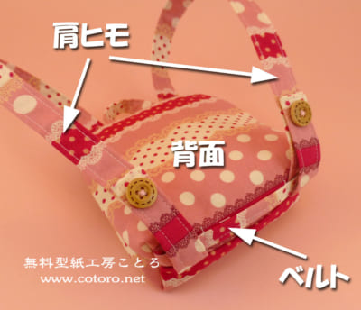 ここより上で紹介した写真は、シーチング生地(薄めの生地)の裏に厚手のアイロン接着芯を貼ったもので本体を作ってあります(ヒモやベルトには芯を貼っていません)。