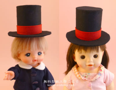 メルちゃん(左)とぽぽちゃん(右)にかぶせてみました。もっと小さくして、(人形にとっての)ミニシルクハットにしてもいいですね。